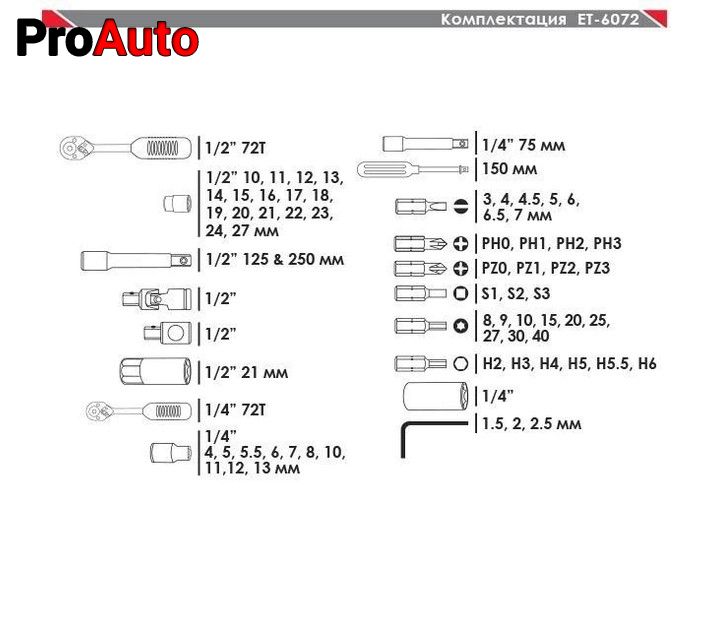 Набір інструментів INTERTOOL ET-6072 - незамінна річ для найрізноманітніших потреб в обслуговуванні автомобіля. Такий набір відмінно зарекомендував себе в застосуванні на СТО та в автомайстернях. Набір складається з 72 одиниць з робочими квадратами 1/2" та 1/4", практичний та надійний в експлуатації. Всі насадки виготовлені з хром-ванадієвої сталі, що забезпечує високі експлуатаційні характеристики, а також захист від корозії. Набір укомплектований в зручний пластиковий кейс. Невеликі габарити набору, дозволяють зберігати його як в гаражі, так і вдома.